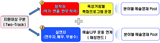 - 기존의 단순한 장르별 구분에서 탈피하여 예술활동 유형을 기준으로 창작자와 실연자로 이원화하여 지원