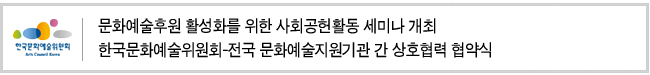 - 본 세미나와 협약을 통해 한국문화예술위원회와 시·도 문화재단, 기업이 함께하는 범국가적 문화예술후원이 확대되어, 보다 더 많은 사람들이 문화예술의 기쁨을 공유하고 그 가치에 대한 사회적 공감대가 더 많아질 것으로 기대된다.