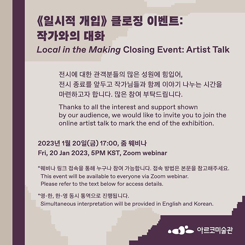 《일시적 개입》 연계 프로그램_클로징 이벤트:작가와의 대화 Local in the Making Closing Event:Artist talk 전시에 대한 관객분들의 많은 성원에 힘입어, 전시 종료를 앞두고 작가님들과 함께 이야기 나누는 시간을 마련하고자 합니다. 많은 참여 부탁드립니다. thanks to all the interest and support shown by our audience, we would like to invite you to join the online artist talk to mark the end of the exhibition 2023. 1. 20(금), 17:00, 줌 웨비나 fri, 20 jan 2023, 5PM KST, Zoom webinar *웨비나 링크 접속을 통해 누구나 참여가능 합니다. 접속 방법은 본문을 참고해주세요 this event will be available to everyone via Zoom webinar. please refer to the text below form access details * 영-한, 한-영 동시 통영으로 진행됩니다. simultaneous interpretation will be provided in English and korean