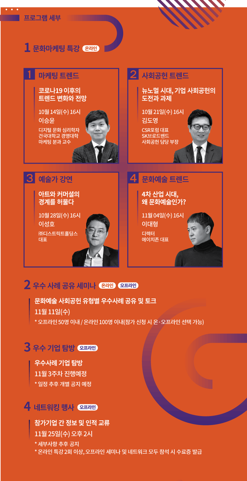 2. 온라인으로 진행되는 문화마케팅 특강과 사례공유 세미나는 부분 참여가 가능하며, 우수 기업 현장 탐방, 네트워킹 행사 등 오프라인 행사는 부분 참여가 어렵습니다. 온라인 교육은 각 강좌가 시작되기 2주 전부터 별도 문의 주시면 운영사무국에서 확인 후 신청을 도와드릴 수 있습니다.