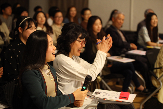 김소희 배우의 강연을 마치고 질의응답 시간을 가졌는데요. 연세가 지긋하신 어르신부터 미래의 연극배우를 꿈꾸는 배우지망생까지 다양한 연령의 다양한 직군의 사람들이 찾아준만큼 정말 많은 질문이 쏟아졌습니다. 그만큼 오늘 강연을 통해 느낀바와 생각할 거리가 많았다는 방증이기도 할텐데요. 한 여고생은 김소희 배우처럼 되는게 꿈이라며 함께 무대에서 연극해보는게 소원이라고 말하기도 했습니다. 그러자 김소희 배우도 무대로 직접 불러 함께 이야기하는 시간을 갖기도 했습니다. 저 학생에게는 정말 잊지 못할 추억이 됐을거라 생각됩니다.