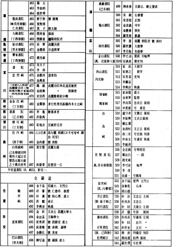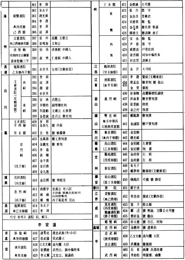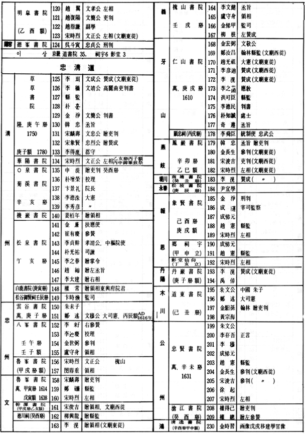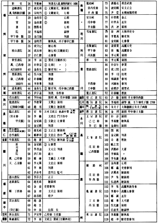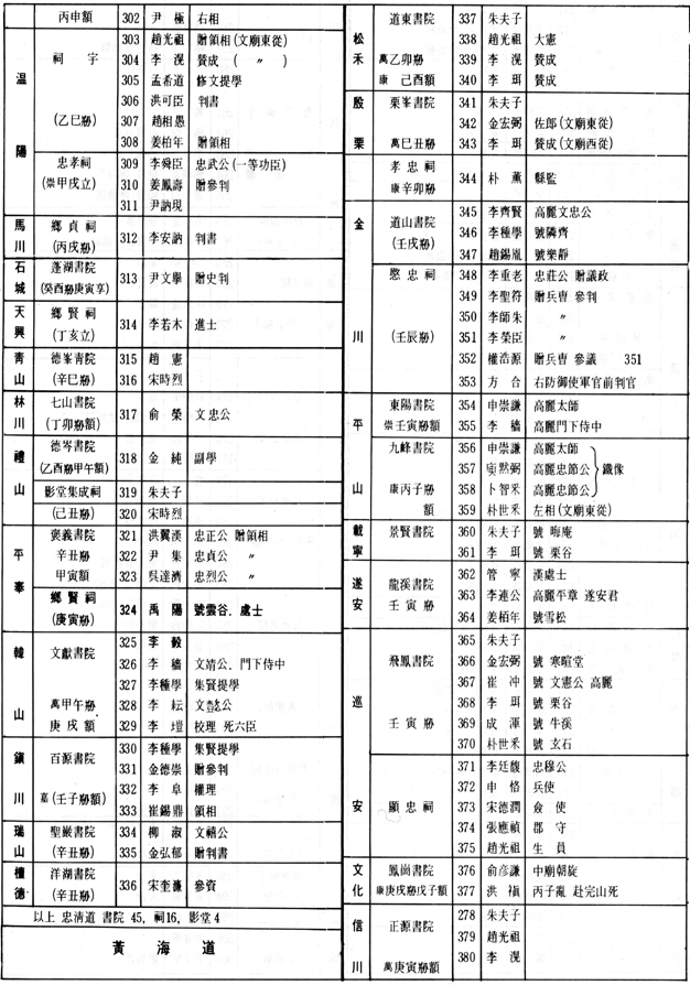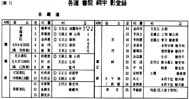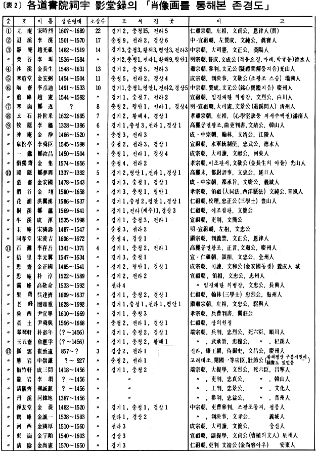조선초상화 인명록에는 아동국선원계록, 문묘배형록, 태묘배형록, 황각록, 문형록에 이어 함경도와 강원도가 빠진 전국 각도서원사우영당록(<표1>은 이를 보기 쉽게 배열할 것)이 있어 당시의 영정인물 상황을 알 수 있게 한다.