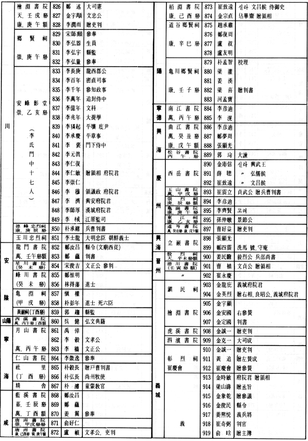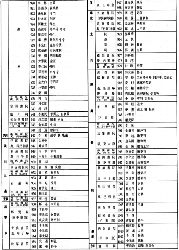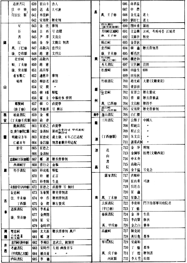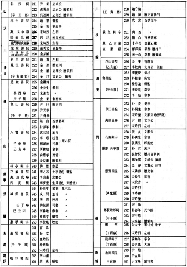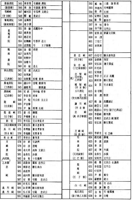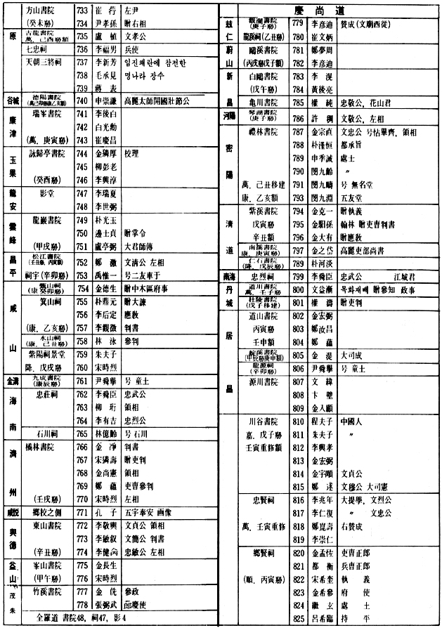 조선초상화 인명록에는 아동국선원계록, 문묘배형록, 태묘배형록, 황각록, 문형록에 이어 함경도와 강원도가 빠진 전국 각도서원사우영당록(<표1>은 이를 보기 쉽게 배열할 것)이 있어 당시의 영정인물 상황을 알 수 있게 한다.