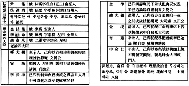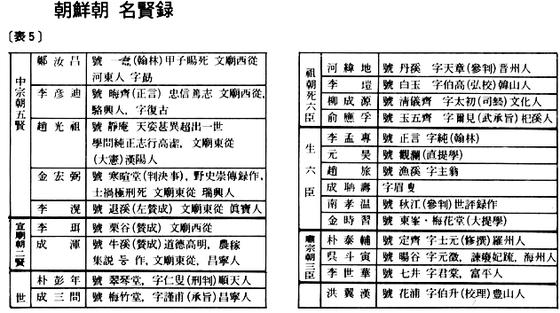 <표5>의 중종조의 5현, 선조조의 2현, 세조조의 사육신. 생육신. 숙종조의 3신, 인조조의 삼학사, 경종조의 4대신, 중종조의 8현 그들 모두 주어진 상황에서 최선을 다한 명현들이요, 정의의 사나이들이다. 어찌 그들의 초상을 만드는데 인색할 수 있겠는가?