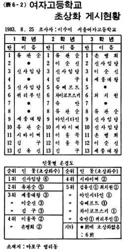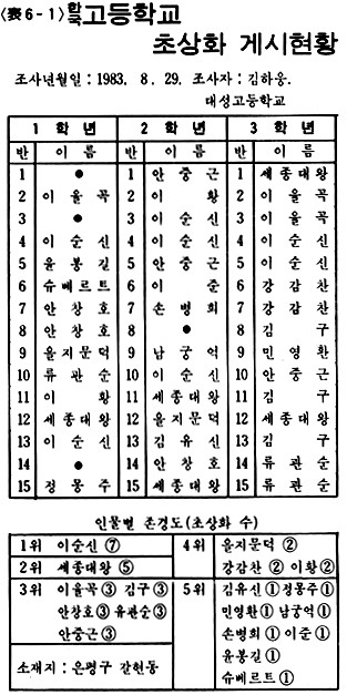 1983년 서울에 있는 남녀고등학교 2개교를 대상으로 초상화 게시현황을 조사했더니 <표6>과 같은 통계를 얻을 수 있었다. 남자 45개 학급과 여자 39개 학급 총84개 학급중 초상화가 없는 반은 10학급이었고 게시된 학급은 74개 반이었다.