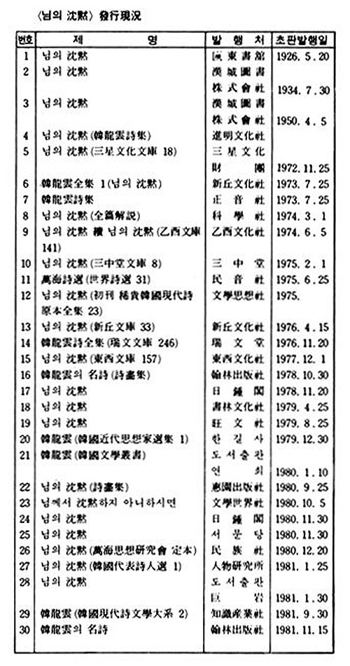 1981년 말까지 출판된 「님의 침묵」류(類)의 출판현황을 보면 아래와 같다.