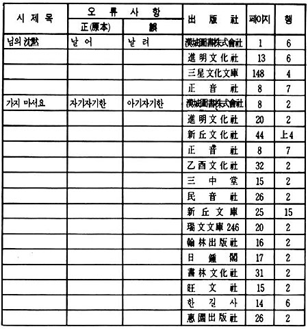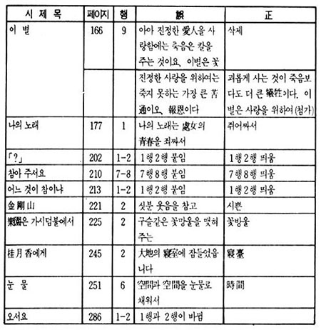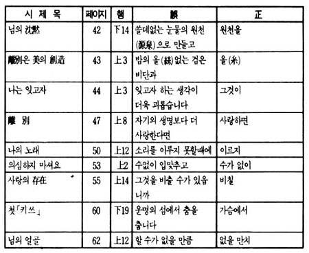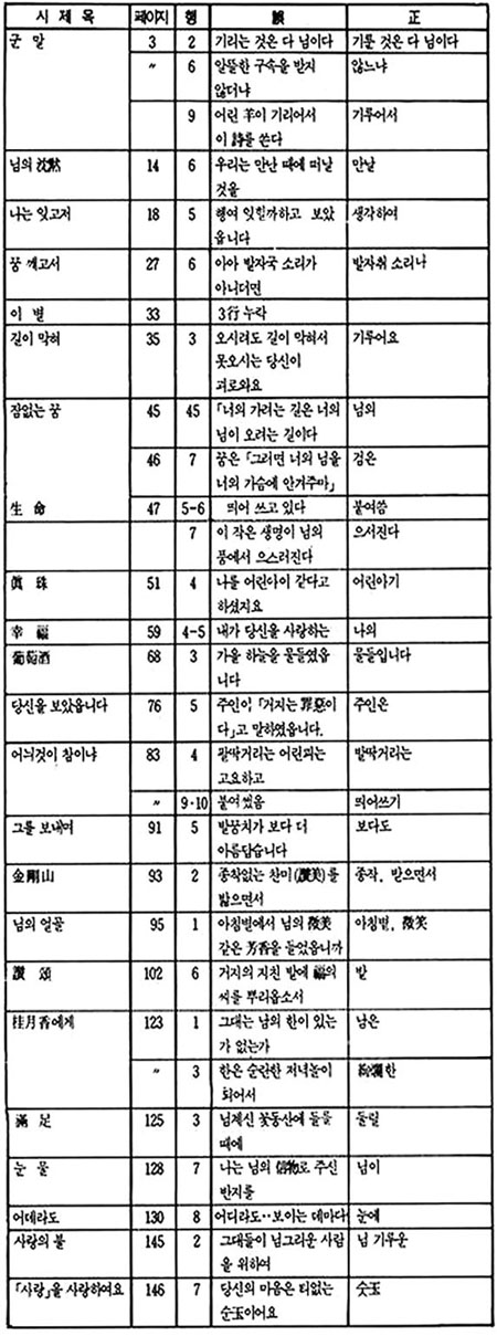 에서 '잠자리'를 '잠짜리'로 고쳐 놓았으며 <나의 노래>에서 '노래 가락'을 '노래 까락'으로, <사랑의 측량(測量)>에서 '많을 수록'을 '만을 쑤록'으로 '적을수록'을 '적을 쑤록'으로, <착인(錯認)>에서 역시 '잠자리에'를 '잠짜리에'로, <당신을 보았읍니다>에서 '저녁거리가'를 '저녁꺼리가'로, <논개의 애인이 되야서 그의 묘(廟)에>서는 '글자를'을 '글짜를'로 고쳐놓았다. 이밖에 한자의 오자가 있고, 행간을 이어 쓴 것, 조사를 바꾸어 놓은 것 등 많은 오류를 범하고 있다. 더더욱 큰 문제는 이후 출판물들이 이와 같은 오류를 수정하지 않고 그대로 답습해 나가는 데에 있다.