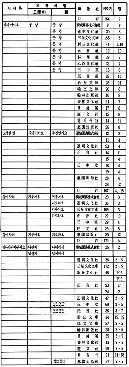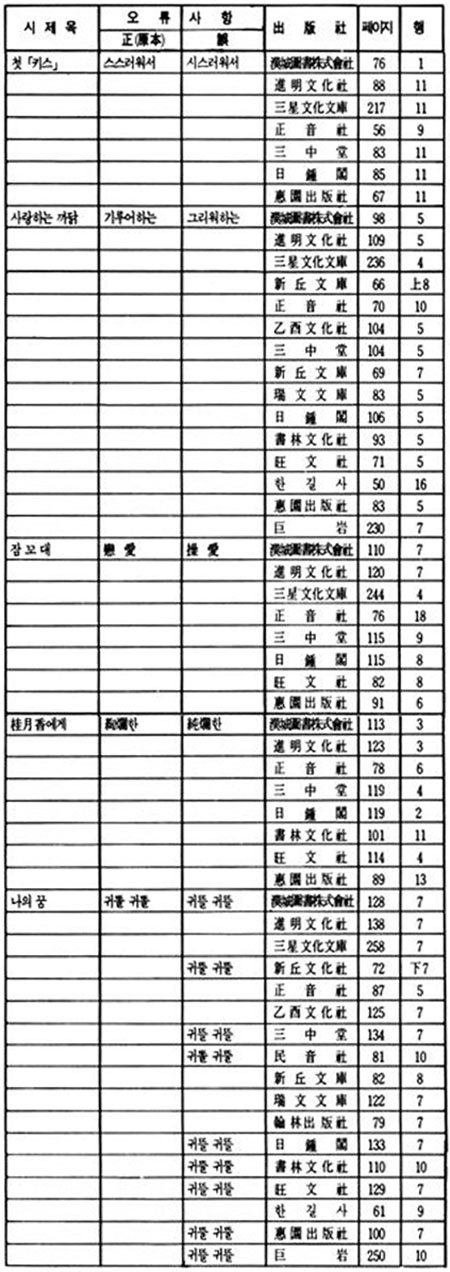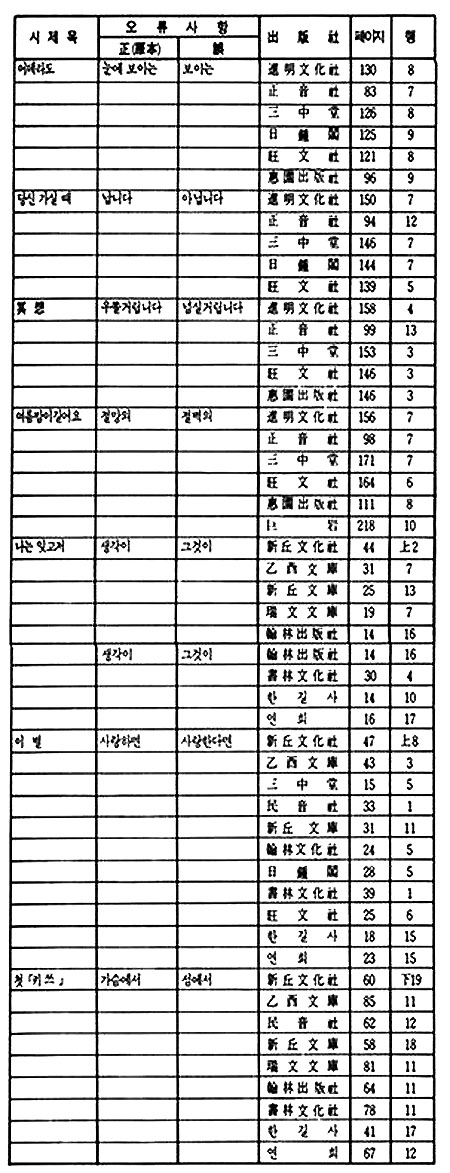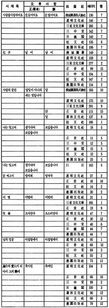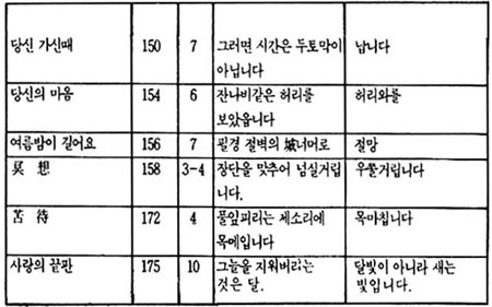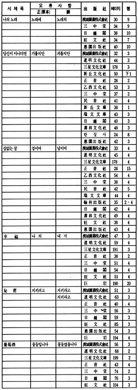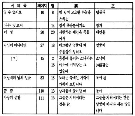 이상 정음사 본은 진명문화사 본의 오류를 그대로 답습하되, 여기에 또 <나는 잊고저>에서 '잠'을 '잠시'로 변모되었고 <사랑의 끝판>에서는 '달빛이 아니라 새는 빛입니다'를 '닭'으로 변모시켰다. 아이러니가 아닐 수 없다. 이는 신구문화사 본과 같은 해에 출간되었으면서도 원본에서 더 멀어져 가는 상황을 낳고 있다.
