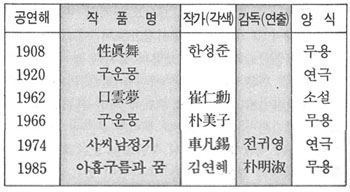 김만중은 한문, 한글의 두 가지 문자로 창작한 관념소설 구운몽과 국문소설로 謝氏南征記를 창작하였다. 구운몽은 1920년에 연극화되고, 1962년에 최인훈에 의해 소설화된 <구운몽>을 제외하고는 모두 무용의 형식으로 재창조되었다. 즉 1908년에 한성준에 의한 性眞舞를 비롯하여, 1966년 朴美子의 <구운몽>, 1985년 컨템포러리 공동안무로 <아홉 구름과 꿈>이 공연되었다. 또 사씨남정기는 車凡錫극본, 전귀영 연출로 1974년에 연극화 되었다.