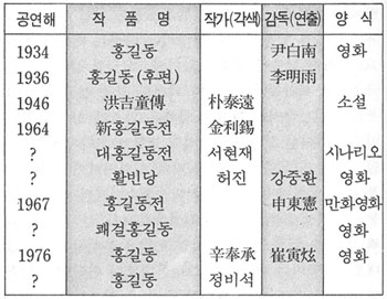 전체적으로 보면, 창작계 고전소설의 개작 내지 재창조는 박지원의 한문단편 중 양반전, 허생전과 김만중의 구운몽, 허균의 홍길동전이 주류를 이루고있다. 이 중에서 홍길동전은 1946년에는 朴泰遠에, 1964년에는 金利錫에 의해 소설화가 된 것을 제외하면, 영화로 현대화되었음이 주목된다. 즉 1934년에 윤백남 각색, 김소봉 연출, 감독으로 경성촬영소에서 영화화한 것을 비롯하여, 그 후편이 1936년 李明雨 감독, 촬영으로 같은 경성촬영소에서 나왔다. 1960년대 후반에는 허 진 각색, 강중환 감독에 의하여 합동영화사에서 활빈당이란 제목으로 영화화했고, 1967년에는 만화영화가 申東憲 감독에 의하여 세기상사에서 제작되었다. 그후에도 쾌걸 홍길동이란 표제로 유일수 각색, 임원식 감독에 의해 대양영화사에서 작품화했고, 1976년에는 辛奉承 극작, 최인현 감독에 의하여 삼영필림주식회사에서 촬영하였다. 그후에도 정비석 각색의 흥길동이란 표제로 김일해 프로덕션에서 영화화되었다.
