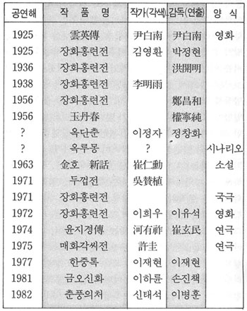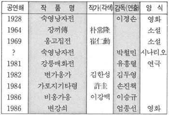 고 소설 중에서 그 예술성이 평가된 고전소설도 현대의 문인, 예술가에 의하여 개작 내지 재창조의 대상이된 작품은 극소수의 작품으로 한정되고 있다.