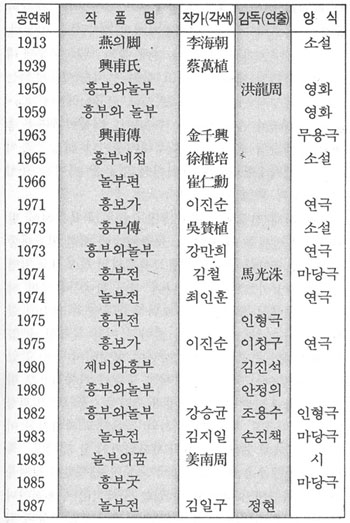 흥부전의 개작, 재창조는 소설로는 1913년 李海朝의 <연의각>이란 신소설화 이후, 1939년 蔡萬植이<興甫氏>를, 1965년에 徐槿培의 <흥부네 집>이, 1966년에 崔仁勳의<놀부뎐>, 1973년에 吳贊植의 <흥부傳>으로 현대화되었다. 또 영화로는 1950년에 洪龍周 감독에 의한 <흥부와 놀부>가 금강영화사에서 촬영된 이후, 1959년에는 코미디 영화로 <흥부와 놀부>가 나왔다. 1963년에는 金千興에 의해 무용극 <흥부전>이 공연되었고, 1971년에는 李眞淳 극본 <흥보가>란 연극이 동국대 연극영화과에서, 1973년에는 강만희 극본으로 주한 외국인 유학생이 <흥부와 놀부>를, 1974년에는 김철 극본, 마광수 연출로 연세대 교양학부 연극반에서, 1974년에는 최인훈 극본의 <놀부전>이 민예극장에서 공연되었고, 이 극본은 77년과 79년 81년 허규 각색으로 민예에서 재공연되었다. 또 1975년에는 인형극 <흥부전>이 현대인형극회에서, 이진순 극본, 이창구 연출로 아동극단 무지개에서, 1980년에는 김진석 연출로 <제비와 흥부>가 한국청소년연극협회에서, 안정희 연출의 <흥부와 놀부>가 꼭두놀음패 초란이에서, 1982년에는 강승균 극본, 조용수 연출의 인형극 <흥부와 놀부>가 현대인형극장에서, 1983년 김지일 극본, 손진책 연출로 <놀부전>이 마당극으로, 1985년에는 아마츄어 연극인들에 의한 맹인돕기 자선공연인 <흥부굿>이 파고다극장에서, 1987년에는 김일구 제작, 정현 연출로 <놀부전>이 마당극으로 공간사랑에서 공연되었다. 이 이외에도 1983년에는 고전을 소재로 시화 작업을 즐겨하는 姜南周에 의하여 <놀부의 꿈>이란 시가 木馬(목마) 13집을 통하여 발표되었다.