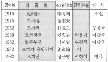 토끼전의 개작, 재창조를 개관해 보면, 소설로는 1916년에 이해조의 <토의肝>이 신소설로 나왔고, 1945년에는 金南天의 <토끼傳>이 창작되었다. 무용극으로는 朴成玉에 의한 <토끼전>이 1952년에 발표되었다. 가장 활기있는 창작이 된 영역인 연극화는, 1987년에 안종관 극본, 박룡기 연출의 마당극<토선생전>이, 1982년에는 김지일 극본, 손진책 연출의 마당극 <별주부전>이, 신근영 극본, 서현석 연출의 <토끼전>이, 1984년에는 안종관 극본, 권재우 연출의 마당극 <토선생전>이 재공연 되었다. 시조는 1982년에 姜寅翰의 <토끼가 용왕님께>가 圖卓시집을 통하여 발표되었고, 1985년에는 李大永의 <토끼전>이 詩圖시집을 통하여 발표되었다.