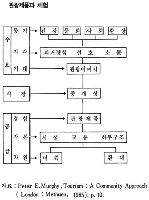 다음 그림에서 보는 바와 같이 관광 목적지 supply는 경험, 자본, 자원을 혼합하여「관광제품」을 판매하는데 이 제품은 단적으로 표현하면 「체험」이라 할 수 있고 관광수요자의 관광 동기, 지각, 기대 또한 과거의 체험이나 현재의 관광 이미지가 관광행위를 촉발하는 관건임을 알 수 있다. 관광자의 문화충격과 적응에 관한 연구는 아직 유아기에 있으나 방문지의 관광「체험의 질」여하에 따라 관광매력성을 측정하는 지렛대가 될 것이다.