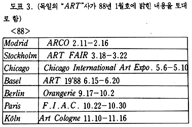88년 들어 새로이 평가되고 있는 전람회들도 있다. 공통된 의견을 수렴하여 대략 추려 보면 매년 초 2월에 스페인 마드리드에서 개최되는 ARCO, 스웨덴 스톡홀름에서 3월에 개최되는 스톡홀름 아트페어, 6월에 시카고에서 열리는 시카고 인터내셔널 아트 엑스포, 역시 6월에 개최되는 스위스 바젤 아트페어, 9월에 열리는 베를린의 오랑즈리, 10월에 파리에서 개최되는 FIAC, 11월에 쾰른에서 열리는 아트 콜론 등을 들 수 있다. 자세한 올해의 회기와 정확한 전람회 명칭은 도표를 참고로 하면 좋겠다.