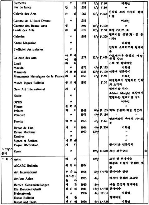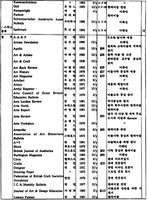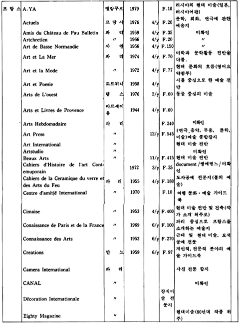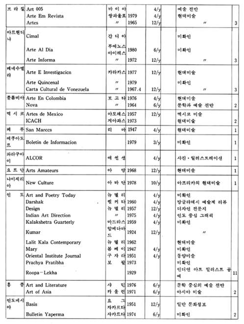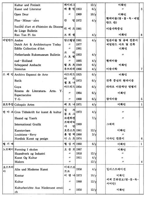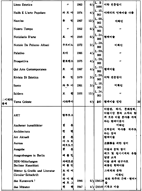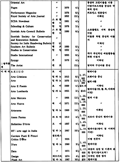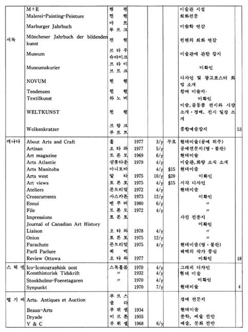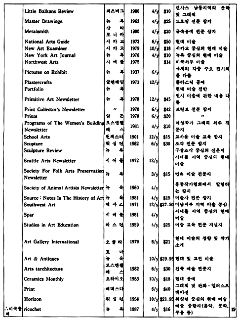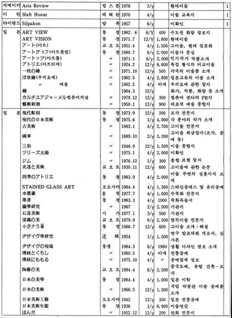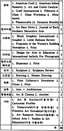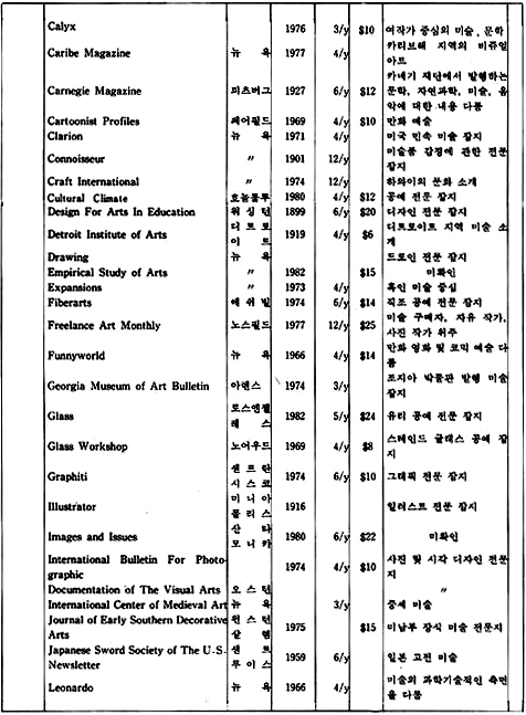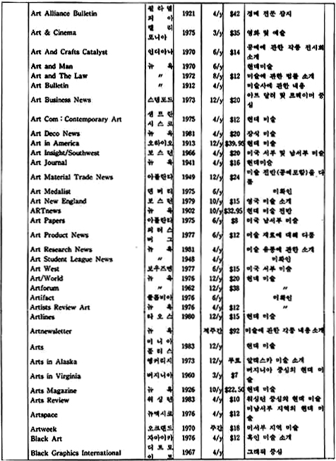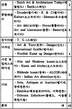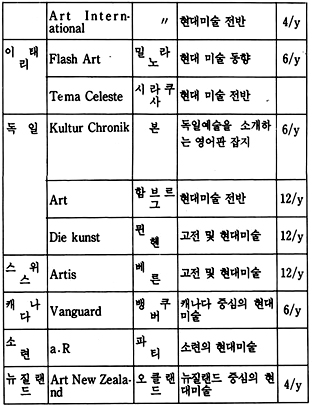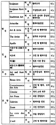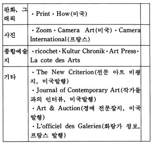 「The New Criterion」은 미국에서 발행되는 잡지로 예술 전반에 걸친 비평가들의 신랄한 비평을 심도있게 다루고 있는 예술 비평 전문지이다. 역시 미국에서 발행되는 계간지「Journal of Contemporary Art」는 작가들과의 인터뷰 내용을 위주로 꾸며가는 기자들의 잡지이다.「How」는 현대 그래픽과 일러스트레이션을 중심으로 다루는 응용미술 분야의 잡지로 미국에서 발행되고 있으며,「Décoration International」과「Vogue Décoration」은 불란서에서 발행되는 응용미술 분야의 전문 잡지이다.