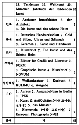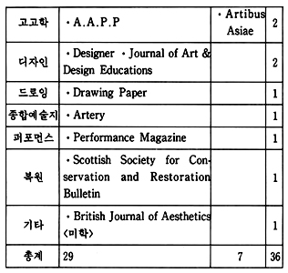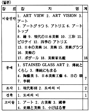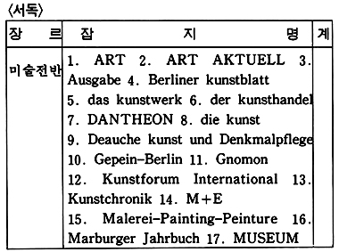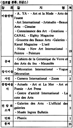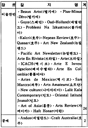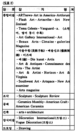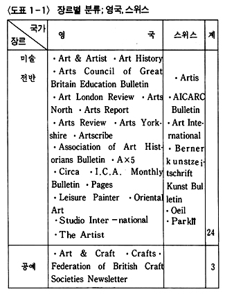 이렇게 하여 언어권을 중심으로한 잡지 소개는 일단락을 짓고 회화, 조각, 공예, 건축, 사진, 종합 예술지 등 미술 장르에 따른 소개를 함으로써 필요한 자료를 일목요연하게 알아볼 수 있도록 해 보자. 장르별 분류인 도표 2를 참고로 가능한 한 앞에서 언급되지 않은 잡지들을 간략하게 소개하기로 하겠다.