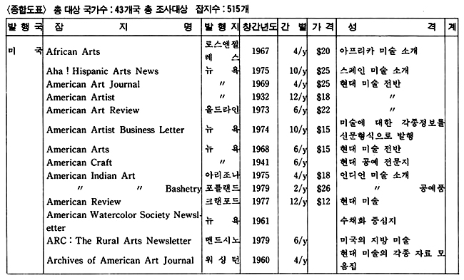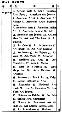 미국 뉴욕에서 발행되는「ART news」는 내용이 크게 Features와 Departments 두 부분으로 나뉘어, 전자엔 현대 미술의 흐름을 다양하게 싣고 있으며 후자에는 11개의 세부 항목-vasari diary, art market, nation, international, spotlight, book reviews, artful, traveler, studio, reviews, new materials, perspective-이 고정적으로 실린다.「Art in America」는 뉴욕의 Brant Art Publications Incorporated에서 발행되는 잡지로 새로운 이즘, 작가, 미술계의 동향 등을 소개하는 부분과, 고정란으로「Letters」,「Reviews of Books」,「Art world」,「Report from∼」이 있으며 그 외 사진, 비디오, 댄스, 패션 등을 다루기도 한다. 그리고 매년 8월 호에는 화랑, 미술관, 작가에 대한 annual guide가 함께 발행된다.