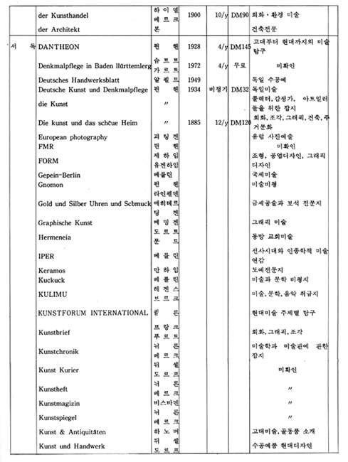 이번에는 독어권을 보자. 독어권의 잡지는 독일을 비롯하여 오스트리아, 스위스 등지에서 출간되고 있는데, 그 종류 또한 엄청나다 할 수 있다. 여기서는 우선 가장 비중 있는 몇 잡지만을 살펴보기로 한다. 국내에서도 익히 알고 있듯이 질적인 면과 양적인 면에서 최고의 잡지라는 인정을 받고 있는「KUNST FORUM International」은 독일 Köln에서 발행되고 있으며, 각 권마다 특별한 주제를 설정하여 그 주제에 해당하는 기사 및 자료를 수록하고 있다. 예컨대 지난 85년 5월∼9월의 제90호에서는 Kassel에서 개최된 documenta 8 展이 그 주축을 이룬 바 있다. 또한 이 잡지는 미술의 모든 영역에서 그 주제를 편견 없이 수용하고 있다는 점에서 폭넓은 독자층을 형성하고 있다. 독일 함부르크에서 발행되는「ART」는 미술의 모든 장르에서 주요 흐름 및 부각되는 작가를 조명하고, 유명 미술관과 화랑의 전시회를 평론가의 시각에서 소개, 과거의 미술과 오늘의 미술을 비교·분석하는 데 중점을 두고 있다. 미술 관계 신간서적 및 카탈로그를 소개하는 난이 있으며 화보가 뛰어나다. 스위스 베른에서 발행되는「Artis」는 각 나라의 주요 전시회를 평론가의 시각에서 소개하는 점이 뛰어나며, 경매에 관한 정보를 많이 싣기도 한다.