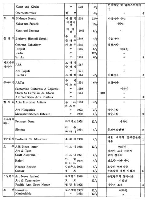 이렇게 하여 각국에서 발행되는 대표적 잡지들을 하나하나 소개해 보고, 최근호에 게재된 내용들을 토대로 굵직굵직한 국제전람회가 전개된 상황, 자주 거론되는 작가들과 그들의 활동, 새로이 부각되고 있는 조류와 경향들에 관해 차례로 요약해 보았다. 미흡하나마 해외 미술에 대한 자료와 정보를 필요로 하는 미술인 들에게 실제적인 도움이 되었으면 하는 바람이다.