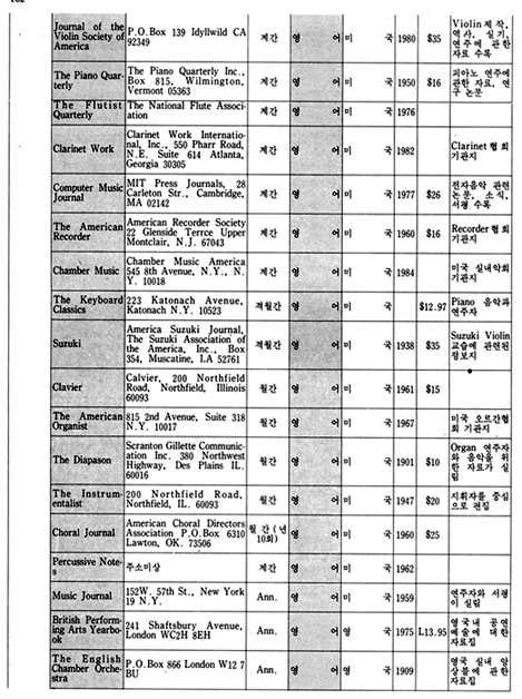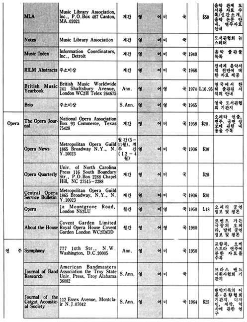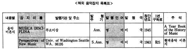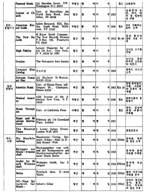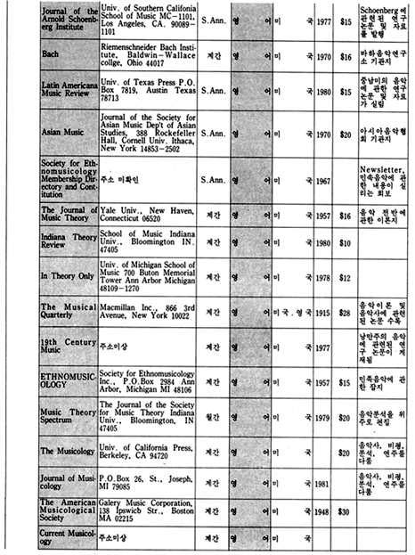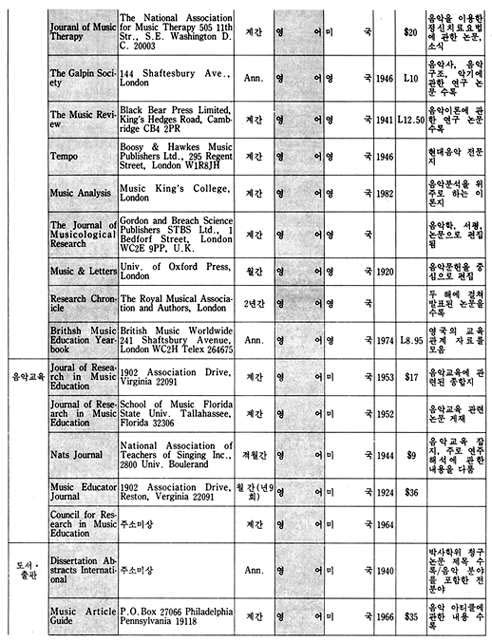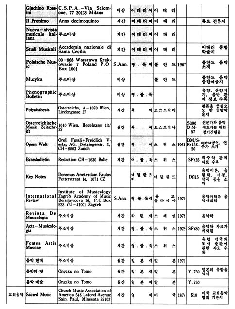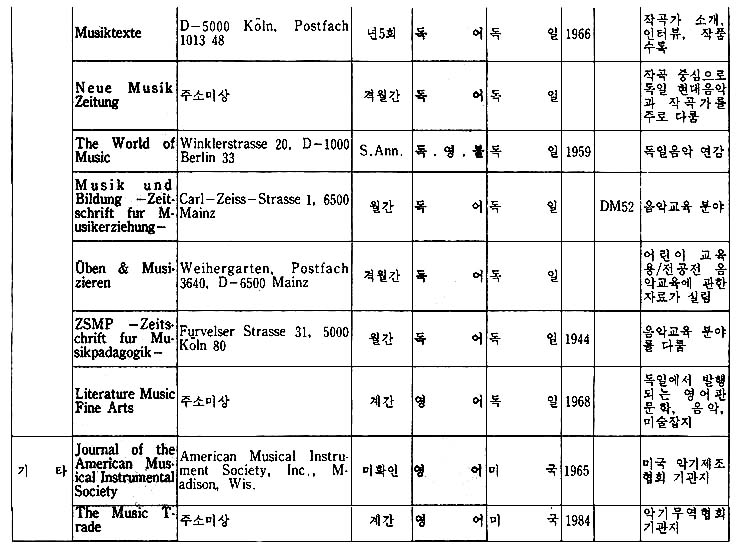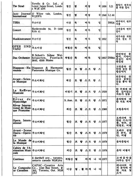 이 지구에는 150여 나라와 그 보다 훨씬 많은 숫자의 민족이 살고 있으며, 그들은 저마다 고유의 역사와 문화를 발전시켜왔다. 그리고 그 문화가 구체적인 모습을 하고 나타나는 것 중의 하나가 예술이라 할 수 있으며, 그러한 예술도 자신의 미학, 철학, 역사적인 환경의 바탕을 가지고 있다. 우리는 예술을 논할 때 일반적으로 그 작품 자체에 대하여 이야기하기 보다는 그 바탕에 깔린 기본 구조에 대한 이야기를 하는 경우가 많은 데, 이런 경우 작품 자체에 대한 논의가 우선 되어지지 않는 이유로는 작품은 작가의 독특한 삶의 표현이라는 특수성 때문에 이야기를 피하고 보다 일반적인 논제로 이야기를 이끌어 가야한다는 인식에서 비롯된 것으로 생각된다. 각 나라에서 발행되고 있는 월간, 계간 등 정기간행물은 각 분야의 일반적인 이야기의 흐름을 담고 있으면서, 자신들의 문화 저변을 모두 포용하고 있음을 읽을 수 있다. 본디 이런 종류의 자료 조사란 모든 나라와 민족을 망라한 가능한 한 모든 자료를 다 수집하며 조사 분석해야 함이 원칙이다. 그러나 전세계 모든 국가에서 발행되는 음악잡지를 전부 수집한다는 것은 현재 우리의 실정으로는 거의 불가능 할 뿐더러, 또한 그것이 갖는 자료적인 의미 또한 생각해 보아야 할 문제였다. 그래서 본 자료를 수집하면서, 처음에는 그 범위를 국내 도서관의 주한 외국문화원에 국한시키는 것을 검토했었다. 그렇게 하면 이 자료 조사에서 제외된 나머지 부분은 Music Index나 Rilm에서 자료를 보충할 수 있으므로, 자료를 애용하는 사람들에게 실질적이고 구체적인 도움을 줄 수 있으리라고 생각했고, 또한 그렇게 함으로써 자료의 정확성도 확보할 수 있기 때문이었다. 그러나 자료의 수집 과정에서 그 범위가 확대되었는데 그 이유는 국내의 자료만 가지고는 종류가 적어 자료 수집의 가치가 떨어짐을 어찌할 수 없었기 때문이며, 또한 이 자료 수집의 가치가 자료의 정확성에 있는 것이 아니라 자료의 다양성에 있는 것이니 만큼 굳이 외국의 자료를 배제하여 자료 수집의 범위를 애써 축소시키려 할 이유도 없었기 때문이기도 하다. 그래서 미국과 독일의 대학 도서관에 소장되어 있는 자료를 활용하기로 하고, 그곳에 유학하고 있는 유학생을 통하여 자료를 입수했다. 다음으로 자료의 분석은 내용, 언어, 국가, 발행주기, 가격, 주소 등으로 분류하는 것으로 정하고, 될 수 있는 한 간단한 주석을 다는 것으로 했다.