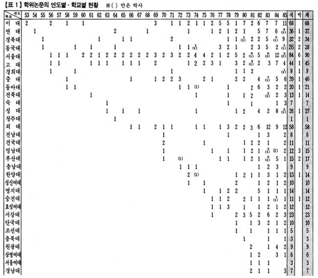 첫째, 해방후 1985년까지 산출된 학위 논문의 수는 석사 669편, 박사 26편, 합해서 695편이다.