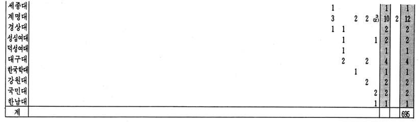 네째, 70년대까지는 각 대학에서 매 해마다 5편 이하의 학위 논문을 내놓고 있으나, 80년대 중반으로 넘어 오면서부터는 그 수효가 급격하게 증가하고 있음을 알 수 있다. 이것은 80년대에 이루어진 대학 정원의 무리한 증원 및 대학원 교육의 강화 추세와도 깊이 관련된 현상이라고 볼 수 있다.