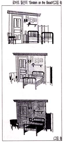 미디어 테크놀로지(Media Technology)로서의 필름과 비디오 그리고 굉장한 음향장비는 실험적인 극장예술에서 전매 특허가 되고 있다. 「스쿠아트 디어터(Squat Theater)」의 『DREAMLAND Burns』는 극장과 영화화의 긴장을 보여주는 예로서, 「우스터 그룹(Wooster Group)」의 『Hamletmachkine』,『The CIVIL Wars』그림2),「임파시불 디어터(Impossible Theater)」의 『Social Amnesia』그림3),「마보마인즈(MabouMines)프로덕션」의 『Hajj』그림4), 로리 앤더슨(Laurie Anderson)의 『Empty Space』와 핑총(Ping Chong)의 『The Angels of Swedenborg』그림5)와 같은 작품들이 실험적인 조명의 정교함과 전자장비에 의한 음향의 변조나 증폭 그리고 비디오그라피(Videography)와 필름, 전통적인 세트와 의상의 새로운 해석을 언어와 합성시킴으로써 시각과 청각의 자극을 요구하는 현대의 관객들에게 새로운 형식으로 다가온 것들이다. 문화적인 현상으로써의 이러한 작품들은 이제는 일반화됨으로써 더 이상 소외된 것들이 아니며, 사회적으로는 그들은 아주 자연스럽게 가정과 은행, 그리고 직장과 같은 일상에 기초를 두고 우리의 기술사회(Technological Society)를 그들의 작품 속에 반영시키고 있는 것이다. 심리학적으로는 개인적인 주체성과 상상력에 대한 대중매체의 영향을 그들의 작품에 새겨놓고 있다. 언어학적으로 그들은 문학적인 것들의 사양과 함께 비디오게임과 교통표지판 같은 범세계적인 기호와 심벌을 전달매체로서 인식하고 있다. 이러한 새로운 형태의 예술형식은 특수한 현대적인 시청각에 대한 지각을 가진 관객들의 요구에 의해 이루어지고 있다. 현대의 미디어 디어터를 감상하는데는 훈련이 필요한데 그것은 마치 차를 타고 가면서 동시에 책을 읽는 것과 같다고 말한다. 필름이 연극적인 프로덕션에 사용된 것은 1927년 베를린의 캐럴 카펙(karel Capek)의 「R.U.R. 오리지널 프로덕션」에서 실제배우와 영화가 함께 공연된 것이 그 첫 번째 시도로 알려져 있다. 그 당시 후면투사(Rear Projection)되는 필름기술을 너무나 새로운 것이어서 화재의 위험을 경찰이 우려했기 때문에 당시 디자이너인 프레데릭 키슬러(Frederik Kiesler)는 스크린 위에 물탱크를 설치하였고 영상은 물이 줄줄 흘러내리는 스크린 위에 투사되었다고 한다. 그 뒤 영상 매체의 사용은 수없이 극장공연에 쓰여지고 그 기술은 발전되어 왔다. 미국의 로버트 윌슨(Robert Wilson)은 시간의 정밀한 계산과 장대한 세트디자인 그리고 과장된 크기의 물체들과 같은 아주 개인적인 이미지를 구체적으로 실물화시킴으로서 관객의 감정과의 교감을 추구하고 있다. 『The Golden Windows』의 거대한 바위와 『Einstein on the Beach』그림6)에서의 공중에 뜬 빛줄기, 『The Forest』에서의 환경음향(Environmental Sound)의 사용, 그리고 조명의 정교한 사용과 필름의 도입은 일찍이 필름이 극장공간의 변화를 가져올 것이라고 예견한 체코슬로바키아의 시노그라퍼(Scenographer)주1) 조셉 스보보다(Josef Sovovoda)를 연상시킨다. 어떤 미디어 디어터는 다른 차원에서 테크놀로지를 무기로서 사용하고 있다. 로리 앤더슨(Laurie Anderson)은 현대기술 사회의 정글 속에 파묻혀 사는 현대생활을 독백과 노래 그리고 전자 음향합성 장치와 필름과 슬라이드를 이용하여 표현하고 있다. 「임파시블 디어터(Impossible Theater)」의 『Social Amnesia』는 9대의 프로젝터와 디졸브 시스템(Dissolve System)을 이용하여 정치와 사회적 비평을 공연 속에 담고 있다.