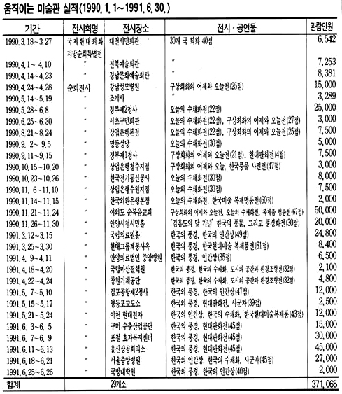 1991년 6월 30일 현재까지 총 29개소의 전시회를 통하여 371,065명에 해당하는 사람들이 미술 작품 감상기회를 가졌다(세부 실적 도표 참조)