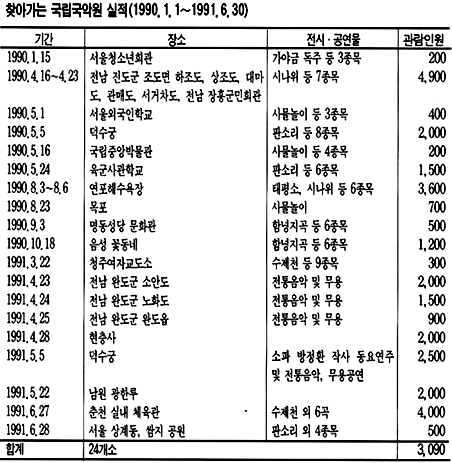 호남지방의 섬 공연(1990년 4월 16일∼23)에서 5,000여 명의 주민들이 열성적으로 호응한 것이나 춘천 실내체육관공연(1991년 6월 27일)에서 4,000여 명이 호응한 것 등은 수준 높은 국악에의 열망으로 해석해야 한다.